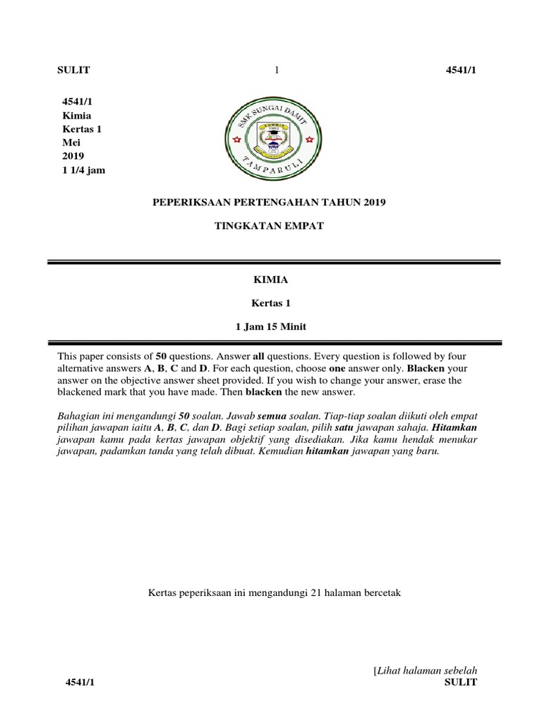 Peperiksaan Pertengahan Tahun Tingkatan 4 Kimia Kertas 1 2019