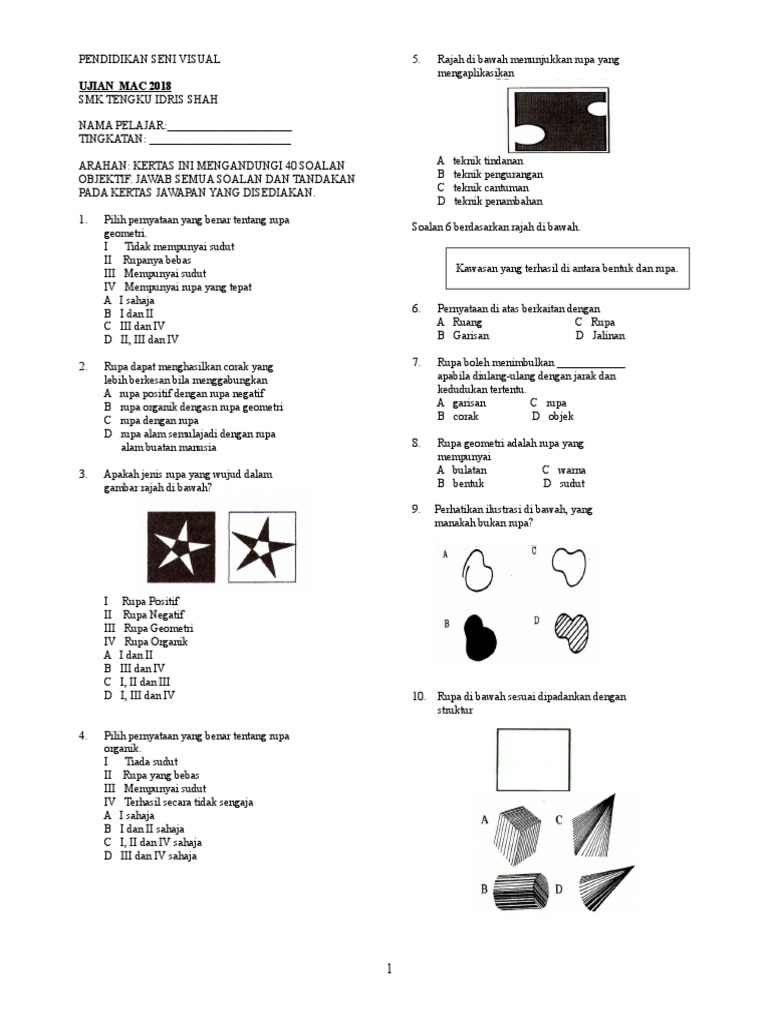 Soalan Pertengahan Tahun Pendidikan Seni Visual Tingkatan 2 E Perkhidmatan. Setiap soalan disertakan dengan empat jawapan sebagai pilihan. Bahasa Melayu BM Bahasa Inggeris Matematik Sains Pendidikan Islam Sejarah Geografi Bahasa Arab Bahasa Cina Bahasa Tamil Asas Sains Komputer ASK Reka Bentuk dan Teknologi RBT.